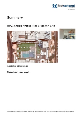 Summary 111/23 Sharpe Avenue Pegs Creek WA 6714 Appraisal price range Notes from your agent © Copyright 2020 RP Data Pty Ltd trading as CoreLogic Asia Pacific (CoreLogic), Local, State, and Commonwealth Governments. All rights reserved.