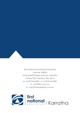 First National Commercial Karratha Licence #38225 Suite 5/2609 Sharpe Avenue, Karratha PO Box 937, Karratha WA 6714 p: +618 9144 2200 | f: +618 9144 2300 e: info@kfnr.com.au w: karratharealestate.com.au Karratha