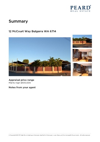 Summary 12 McCourt Way Bulgarra WA 6714 Appraisal price range Mid to high $500,000 Notes from your agent © Copyright 2020 RP Data Pty Ltd trading as CoreLogic Asia Pacific (CoreLogic), Local, State, and Commonwealth Governments. All rights reserved.