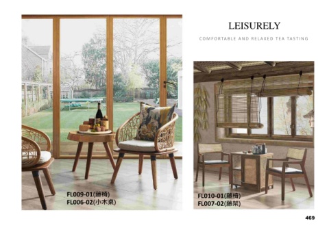 LEISURELY C O M F O R TA B L E A N D R E L A X E D T E A TA S T I N G FL009-01(藤椅) FL010-01(藤椅) FL006-02(小木桌) FL007-02(藤架) 469