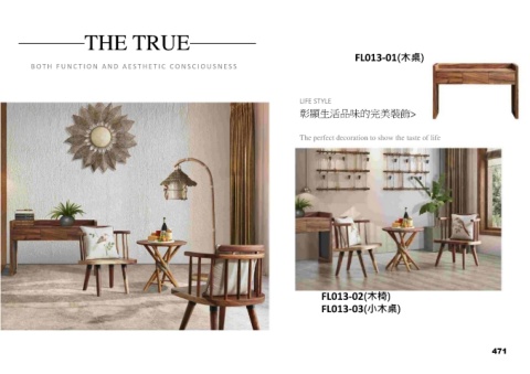 ───THE TRUE─── FL013-01(木桌) B OT H F U N C T I O N A N D A E S T H E T I C C O N S C I O U S N E S S LIFE STYLE 彰顯生活品味的完美裝飾> The perfect decoration to show the taste of life FL013-02(木椅) FL013-03(小木桌) 471