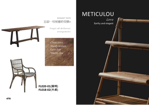 METICULOU ELEGANT TASTE Love 忘卻一切刻意的安排> Earthy and elegant S Forget all deliberate arrangements Clear lines Sturdy texture Love fate Vitality fine FL020-01(藤椅) FL018-02(木桌) 478