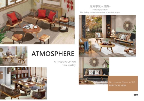 充分享受大自然> Fully enjoy nature The feeling to touch the nature is possible to you ATMOSPHERE ATTITUDE TO OPTION True quality Very strong flavor of life PRACTICAL HIGH 509
