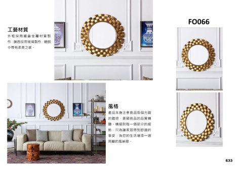 FO066 工藝材質 外框採用 鐵藝金屬 材質製 作,鏡面採用玻璃製作,硬朗 中帶有柔美之感。 風格 產品本身注重商品各個方面 的體現,更顯商品的品質精 髓。精細到每一個部分的細 節,只為讓家居得到舒適的 享受,為您的生活增添一道 亮麗的風景線。 633
