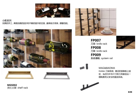 小酌系列 完美的手工,典雅別緻的設計和不斷的提升的品質,贏得各方青睞,讚譽四起。 FP007 刀架 knife rack FP008 刀架 knife rack FP009 系統導軌 system rail MAG&BAOMA Holder 刀架系統,靈活的裝飾板上固 定,為任何外型尺寸的刀具創造出一 個既實用又安全的置放系統。 MGS002 擱板承架 shelf rack 639