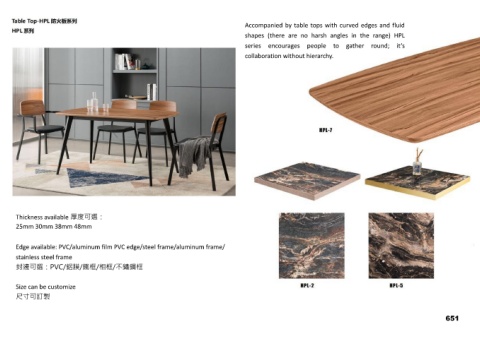 Accompanied by table tops with curved edges and fluid