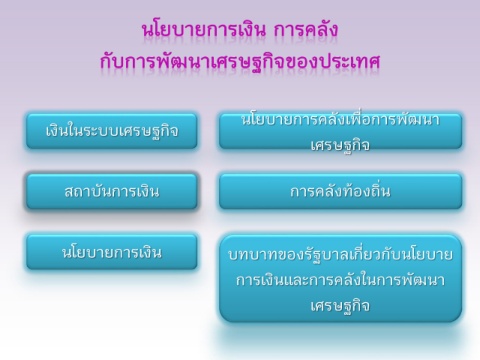 นโยบายการคลังเพื่อการพัฒนา เงินในระบบเศรษฐกิจ เศรษฐกิจ สถาบันการเงิน การคลังท้องถิ่น นโยบายการเงิน บทบาทของรัฐบาลเกี่ยวกับนโยบาย การเงินและการคลังในการพัฒนา เศรษฐกิจ