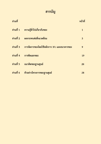 สารบัญ ส่วนที่ หน้าที่ ส่วนที่ 1 ความรู้ทั่วไปเกี่ยวกับขยะ 1 ส่วนที่ 2 ผลกระทบต่อสิ่งแวดล้อม 3 ส่วนที่ 3 การจัดการขยะโดยใช้หลักการ 3Rs และธนาคารขยะ 9 ส่วนที่ 4 การคัดแยกขยะ 19 ส่วนที่ 5 แนวคิดขยะฐานศูนย 26 ์ ส่วนที่ 6 ตัวอย่างโครงการขยะฐานศูนย์ 28