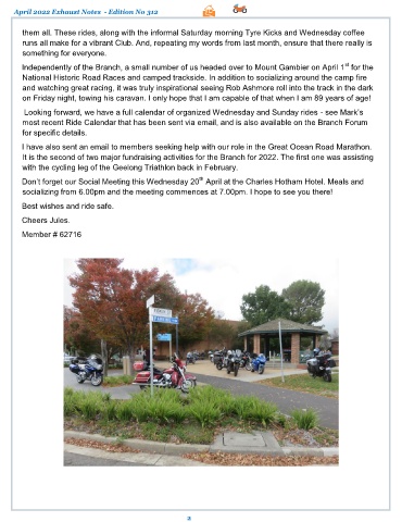 Don’t forget our Social Meeting this Wednesday 20 April at the Charles Hotham Hotel. Meals and