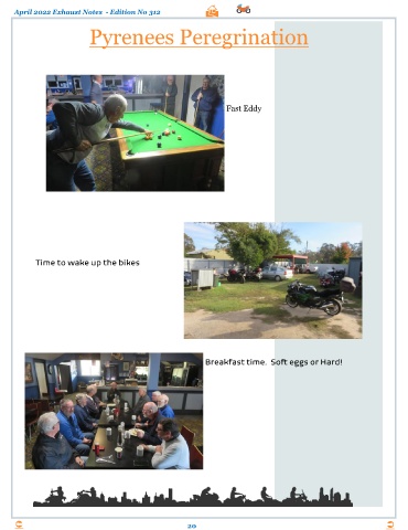 April 2022 Exhaust Notes - Edition No 312 Pyrenees Peregrination Fast Eddy Time to wake up the bikes Breakfast time. Soft eggs or Hard! 20