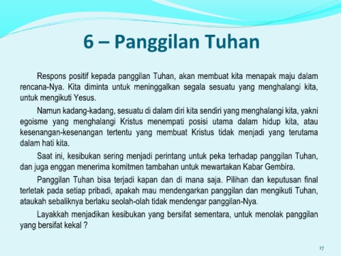 terletak pada setiap pribadi, apakah mau mendengarkan panggilan dan mengikuti Tuhan,
