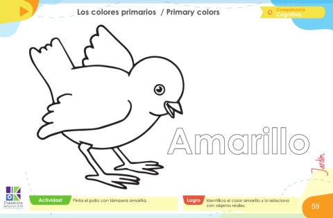 Los colores primarios / Primary colors Competencia Cognitiva Actividad Pinta el pollo con témpera amarilla. Logro Identica el color amarillo y lo relaciona con objetos reales. 59