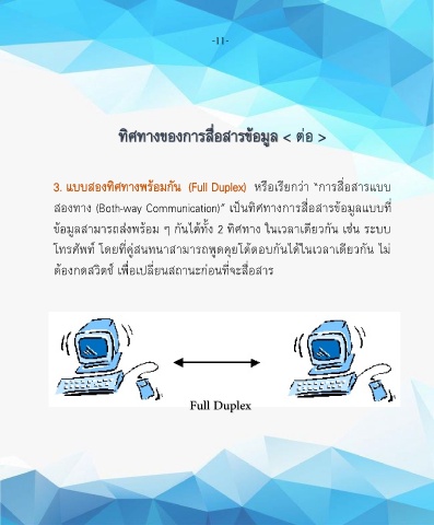 ข้อมูลสามารถส่งพร้อม ๆ กันได้ทั้ง 2 ทิศทาง ในเวลาเดียวกัน เช่น ระบบ