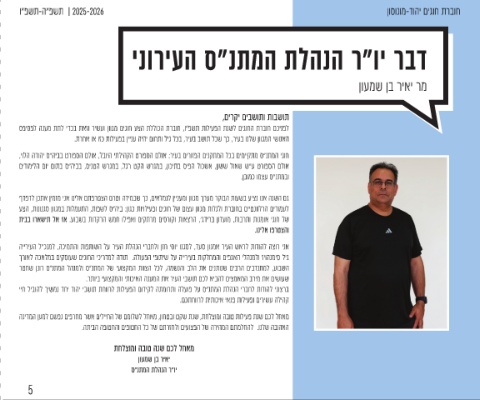 C C M M ןוסונומ-דוהי םיגוח תרבוח דעס ןונמא רמ C C ריעה שאר רבד M M ,םירקי םיבשותו תובשות .ינוריעה ס"נתמהו ןוסונומ-דוהי תייריע לש .ןיינע םוחת לכלו ליג לכל ,דחאו תחא לכל תמאתומה הרישע .ישילשה ליגל דעו הדיל ליגמ יאנפה תועשל ןווגמו בחרנ עציה אוצמל ולכות תרבוחב תיתוברת הביבס ,ריעה יבשותו תובשות ,םכל תתל תנמ לע ,הדיפקב ורחבו ונחבנ תועצומה תויוליעפה יאנפו תוברת ,םיגוחה תרבוח תא םכל שיגהל חמש ינא ,ו"פשת תוליעפה תנשו םידומילה תנש תחיתפ םע ו"פשת-ה״פשת | 2025-2026 ו"פשת-ה״פשת | 2025-2026 C C M M C C M