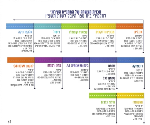 14:20-15:05 :ןורהצו 'ב-'א תותיכ 054-6641179 רברפס יתא :תכרדהב 052-2659322 רוד :תכרדהב 052-6646334 ןמרב ןדיע :תכרדהב 14:20-15:05 :'ו-'ד תותיכ
