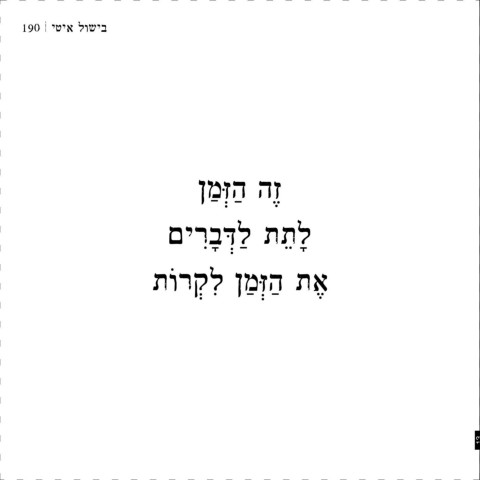 190 | יטיא לושיב .םינפלמש בכרב סנכיהל דמוע התא .עקרב התוא ריכזמש רישב עקוש התא ,דיל הלא ומכ ,התוא ןיימדל לוכי התא ,ןולייא לש םיקקפב ,תינוכמב םימעפלו .ןולחב ,ינשה בכרב טוידיא ומכ ההוב התא ,עגר דועש טלוק התא קוידבו ,ךל םיפצפצמ .דיה תא רעישב ךל הריבעמ ,ףרועב ךל תעגונ .םימתכ אלמ .םינש חקול הז ,ןורכיזהמ ,רחמ דע דרי הז הצלוחהמ ,הבהא הז
