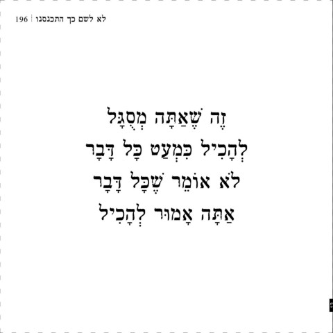 196 | ונסנכתה ךכ םשל אל .תוגרדמ רדחב ןיינבב םיצר .םידרוי אלש הבהא לש םימתכ שי .םידגבהמ ולא וא ,ראווצהמ ולאכ אל .םדרנ אל התאשכ ,םואתפ םיעיפומ םה ,םכל תויהל ולכיש םידליה תא האור התאשכ .תוגוזב םירדוסמ םלוכו ,הדעסמב בשוי התאשכ .םמעושמ התאשכ עובש ףוסב .רקוב תונפל