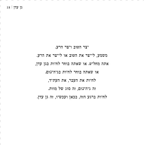 18 | ןדע ןג תויונמדזה | 25 .ערה רציו בוטה רצי .ערה תא רצייל וא בוטה תא רצייל ,עמשמ ,ןדע ןגב תויחל רחוב התאש וא .טילחמ התא .םוניהיגב תויחל רחוב התאש וא ,דיתעה תא ,רבעה תא תויחל .תוומ לש גוס הז ,םוניהיג הז .ןדע ןג הז ,וישכעו ןאכב ,הזה עגרב תויחל 3 2 1