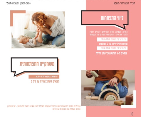 87 86 םכליבשב םישדחתמ ו״פשת הניגב יעיבר 19:00-17:00 תועשה ןיב יעיבר םוי לכב חותפ היהי זכרמה ו״פשת תנש ךלהמב .שדוחל תחא ףלחתמ גוחו ישפוח קחשמ ןמז לולכתו ,םיחאלו םידליל תדעוימ תוליעפה ןוסונומ-דוהי םיגוח תרבוח ,הדיל ירחא םיווחש םיישקה לכ םע 13:30-12:00 תועשה ןיב יעיבר ימי .תוחתפתהה םוחתב םיניינעמו םינווגמ תודדומתהל םילכ תיינקה - םייט יבייב ,תוחתפתהה ילגרס .אמאל ןהו קוניתל ןה םישדוח 3.5 דע הדיל יליגל םיאתמ םיאשונ דועו העונת ,ףוג תפש ,הניש ,הקירוטומ םייט יבייב - תוחתפתה יוויל תויתרבחה תותשרבו 054-2553603 ןופלטב .דועו 11:30-1