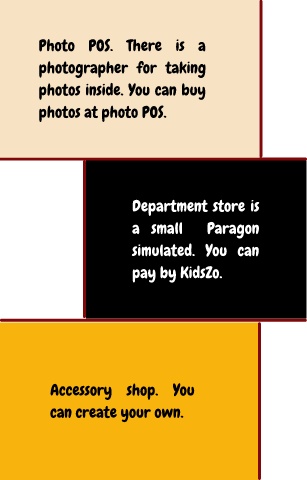 Photo POS. There is a photographer for taking photos inside. You can buy photos at photo POS. Department store is a small Paragon simulated. You can pay by KidsZo. Accessory shop. You can create your own.