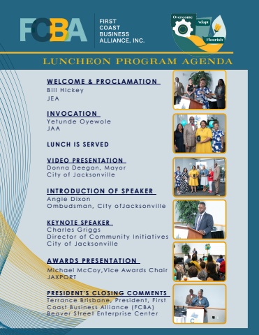 INVOCATIONYetundeOyewolJAAKEYNOTESPEAKERCharlesGriggsDirectorofCommCityofJacksonvVIDEOPRESENTATDonnaDeegan,MCityofJacksonviAWARDSPRESENINTRODUCTIONAngieDixonOmbudsman,CitWELCOME&PROBillHickeyJEAPRESIDENT%u2019SCLOTerranceBrisbaneCoastBusinessAlBeaverStreetEntMichaelMcCoy,VJAXPORTLUNCHISSERVEDLUNCHEO