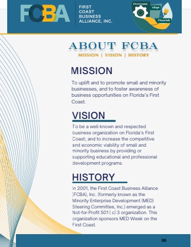 In2001,theFirstCoas(FCBA),Inc.(formerlykMinorityEnterpriseDeSteeringCommittee,InNot-for-Profit501(c)3organizationsponsorsFirstCoast.Toupliftandtoprombusinesses,andtofobusinessopportunitieCoast.Tobeawell-knownanbusinessorganizationCoast;andtoincreaseandeconomicviabilityminoritybusinessbypsupportingeducationadevelopmentprogramVISIONMISSIONHISTORYABOUTMISSION|VISI06
