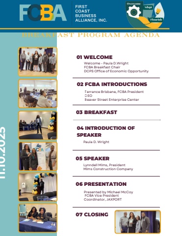 ..07CLOSING05SPEAKER03BREAKFAST01WELCOME06PRESENTATIO02FCBAINTROD04INTRODUCTIOSPEAKERPaulaD.WrightLynndellMims,PresidentMimsConstructionCompPresentedbyMichaelMcCFCBAVicePresidentCoordinator,JAXPORTTerranceBrisbane,FCBAPCEOBeaverStreetEnterpriseCWelcome-PaulaD.WrightFCBABreakfastChairDCPSOfficeofEconomicBREAKFAS