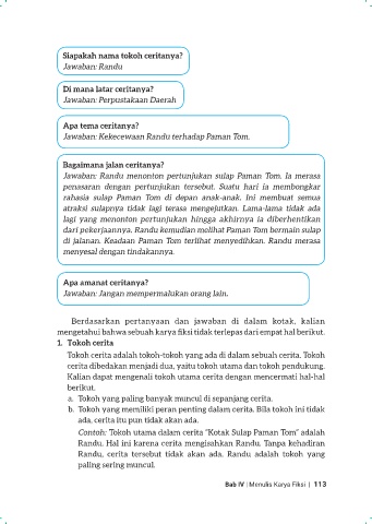 Contoh: Tokoh utama dalam cerita “Kotak Sulap Paman Tom” adalah