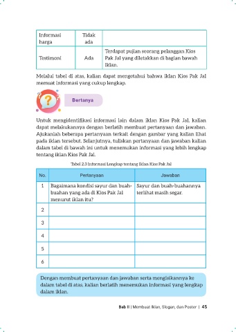 Tabel 2.3 Informasi Lengkap tentang Iklan Kios Pak Jal