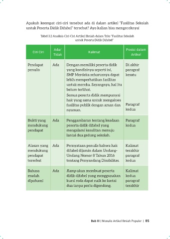 Tabel 3.2 Analisis Ciri-Ciri Artikel Ilmiah dalam Teks “Fasilitas Sekolah