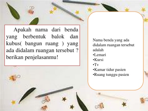 Apakah nama dari benda yang berbentuk balok dan kubus( bangun ruang ) yang Nama benda yang ada didalam ruangan tersebut ada didalam ruangan tersebut ? adalah berikan penjelasanmu! •Lemari •Kursi •Tv •Kamar tidur pasien •Ruang tunggu pasien
