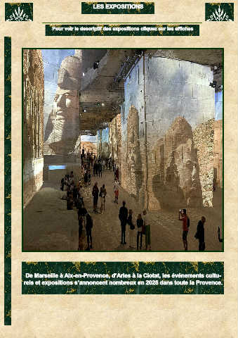 LES EXPOSITIONS Pour voir le descriptif des expositions cliquez sur les affiches De Marseille à Aix-en-Provence, d’Arles à la Ciotat, les événements cultu- rels et expositions s’annoncent nombreux en 2025 dans toute la Provence.