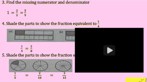 3. Find the missing numerator and denominator 2 5 1 = = 2 5 1 4. Shade the parts to show the fraction equivalent to 4 1 2 1 3 = = 4 8 4 12 1 5. Shade the parts to show the fraction equivalent to 5 1 2 3 = = Jens 5 10 15 Martensson