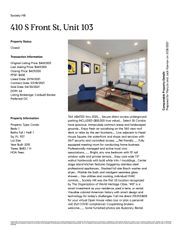 TAX ABATED thru 2025..... Secure direct access underground parking INCLUDED ($50,000 true value).... Select 55 Condos have spacious, immaculate common areas and landscaped grounds... Enjoy fresh air socializing on the 360 view roof deck or relax by the zen fountains..... Live adjacent to Head House Square, the waterfront and shops and services with 24/7 security and controlled access. ,,,,,Pet friendly. ..... Fully equipped meeting room for conducting home business. Professionally managed and active local civic associations......... Bright, airy one bedroom with 10' tall window walls and private terrace.... Easy care wide 7.5" walnut hardwoods with bold white trim / mouldings... Center stage island kitchen features Gaggenau stainless steel professional appliances... Stacked full size Bosch washer and dryer.... Marble tile bath and indulgent seamless glass shower..... Gas utilities and cooking, individual HVAC controls..... Society Hill was the first US location recognized by The Organization of World Heritage Cities. "410" is a smart investment as your residence, pied a terre, or rental. Visualize colonial American history with smart design and technology for today's challenges. Call me direct 215.913.8615 for your virtual Open House video tour or plan a personal visit (full COVID compliance). Cooperating brokers welcome........ Some furnished photos are illustorary. Rental