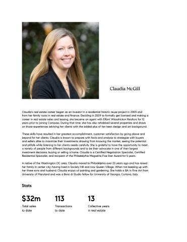 Claudia's real estate career began as an investor in a residential historic reuse project in 2003 and from her family roots in real estate and finance. Deciding in 2009 to formally get licensed and making a career in real estate sales and leasing, she became an agent with Elfant Wissahickon Realtors for 12 years prior to joining Compass. During that time, she has also rehabbed several properties and draws on those experiences advising her clients with the added plus of her keen design and art background.