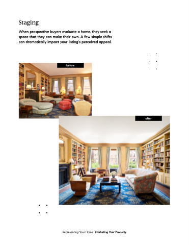 Staging When prospective buyers evaluate a home, they seek a space that they can make their own. A few simple shifts can dramatically impact your listing's perceived appeal. before Representing Your Home | Marketing Your Property after