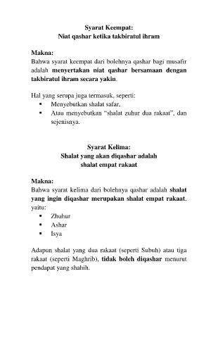 Bahwa syarat kelima dari bolehnya qashar adalah shalat