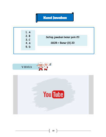 Kunci Jawaban 1. A 2. B Setiap jawaban benar poin 20 3. C 4. A SKOR = Benar (X) 20 5. D VIDEO 10