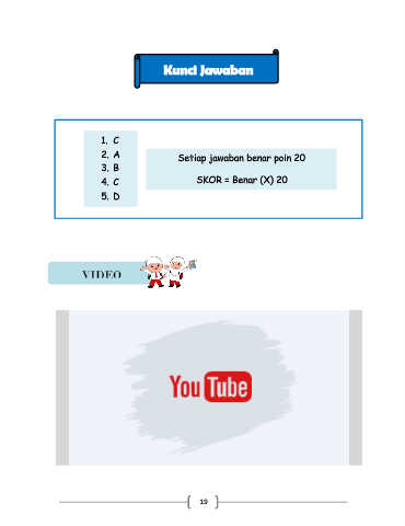 Kunci Jawaban 1. C 2. A Setiap jawaban benar poin 20 3. B 4. C SKOR = Benar (X) 20 5. D VIDEO 19