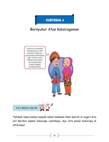 SUBTEMA 3 Bersyukur Atas Keberagaman AYO MENGAMATI Tahukah kamu bahwa banyak sekali makanan khas daerah di negeri kita ini? Berikut adalah beberapa contohnya. Ayo, kita kenali beberapa di antaranya! 20