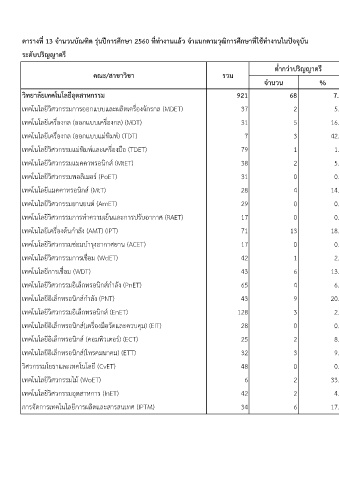 ตำรำงท 13 จำนวนบณฑต รนปกำรศกษำ 2560 ททำงำนแลว จำแนกตำมวฒกำรศกษำทใชทำงำนในปจจบน