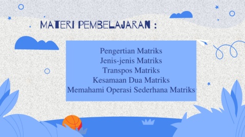 Materi pembelajaran : Pengertian Matriks Jenis-jenis Matriks Transpos Matriks Kesamaan Dua Matriks Memahami Operasi Sederhana Matriks