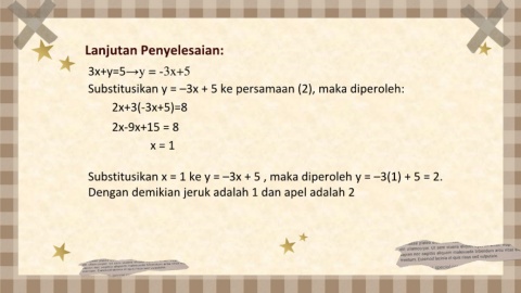 Substitusikan y = –3x + 5 ke persamaan (2), maka diperoleh: