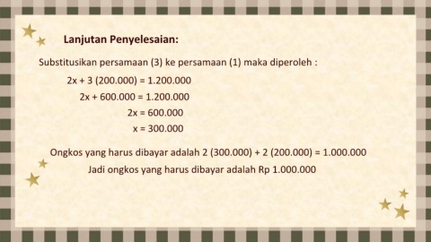 Ongkos yang harus dibayar adalah 2 (300.000) + 2 (200.000) = 1.000.000