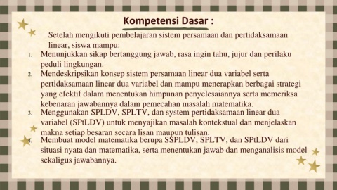 2. Mendeskripsikan konsep sistem persamaan linear dua variabel serta