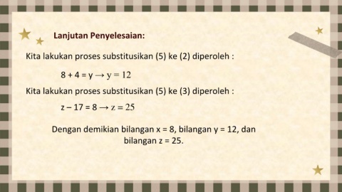 Dengan demikian bilangan x = 8, bilangan y = 12, dan