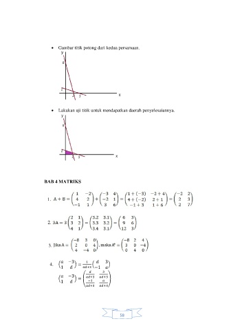 • Gambar titik potong dari kedua persamaan. • Lakukan uji titik untuk mendapatkan daerah penyelesaiannya. BAB 4 MATRIKS 1. 2. 3. −3 1 3 4. ( ) = ( ) 1 +3 −1 3 −3 ( ) = ( +3 +3 ) 1 −1 +3 +3 58