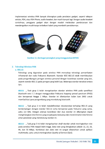 Implementasi  wireless  PAN  banyak  diterapkan  pada  peralatan  gadget,  seperti  telepon