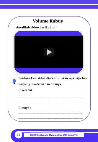 Volume Kubus Amatilah video berikut ini! Berdasarkan video diatas, tuliskan apa saja hal- hal yang diketahui dan ditanya. Diketahui : Ditanya : 21 LKPD Elektronik Matematika SMP Kelas VIII