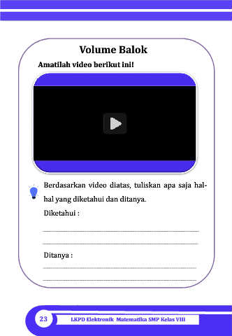 Volume Balok Amatilah video berikut ini! Berdasarkan video diatas, tuliskan apa saja hal- hal yang diketahui dan ditanya. Diketahui : Ditanya : 23 LKPD Elektronik Matematika SMP Kelas VIII